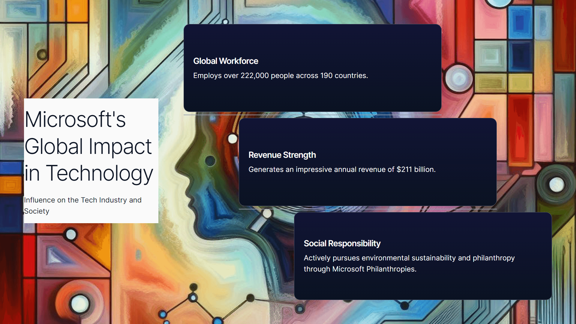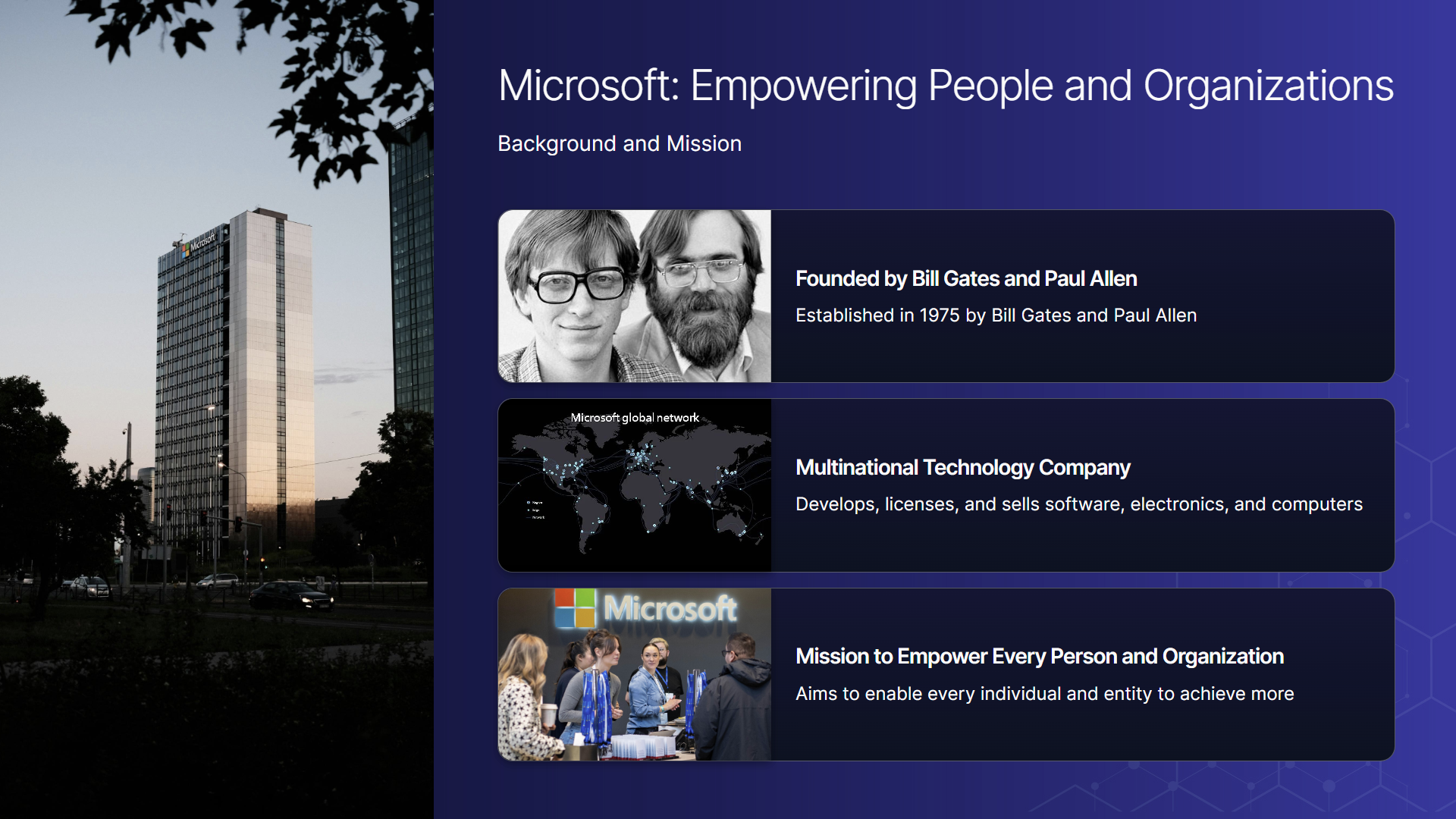 Microsoft is a leading global technology company that develops, manufactures, licenses, and supports a wide range of software products, services, and devices. Founded in 1975 by Bill Gates and Paul Allen, Microsoft is headquartered in Redmond, Washington, and is one of the largest and most successful technology companies in the world. The company's products and services include the Windows operating system, Office software suite, Azure cloud computing platform, and Xbox gaming console, among others. Microsoft is also a leader in the field of artificial intelligence, machine learning, and mixed reality, and has made significant investments in research and development to advance these technologies.