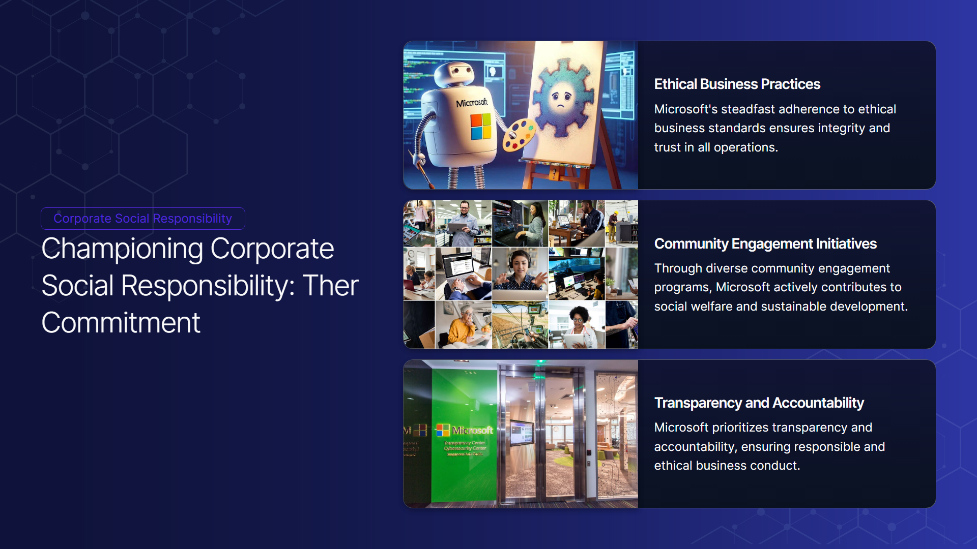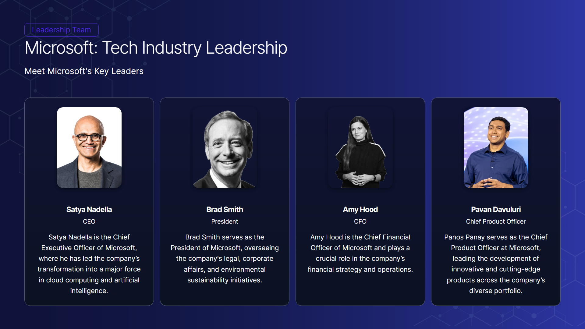 Microsoft's mission is to empower every person and organization on the planet to achieve more, and the company is committed to using technology to drive positive change. Microsoft's products and services are used by billions of people around the world, and the company has a strong focus on innovation, customer satisfaction, and social responsibility. Microsoft has also been at the forefront of the digital transformation, helping businesses and organizations to transition to the cloud, adopt new technologies, and drive digital innovation. With a strong brand portfolio and a commitment to innovation and customer satisfaction, Microsoft continues to be a leader in the technology industry.