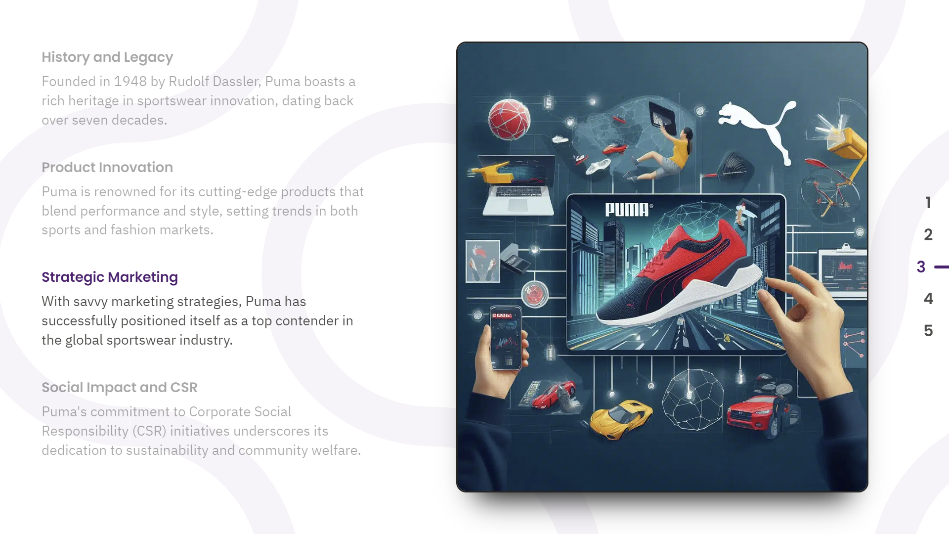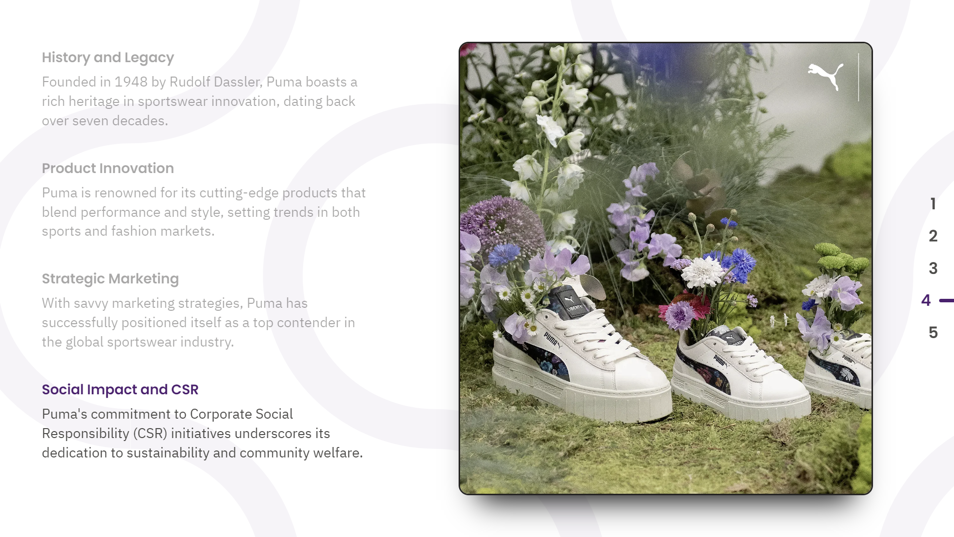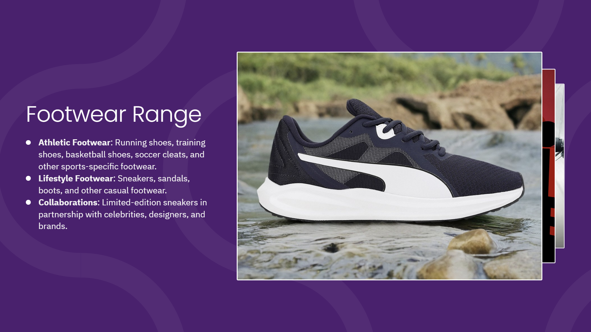 PUMA has a strong focus on innovation and sustainability, and has made significant investments in research and development to create high-performance and eco-friendly products. The company's Forever Faster platform is a key part of its brand identity, and is reflected in its products, marketing, and partnerships. PUMA has also been at the forefront of fashion collaborations, partnering with top designers and artists to create limited-edition collections that are highly sought after by fashion enthusiasts. With a strong brand identity and a commitment to innovation and sustainability, PUMA continues to be a leader in the sports and fashion industries.