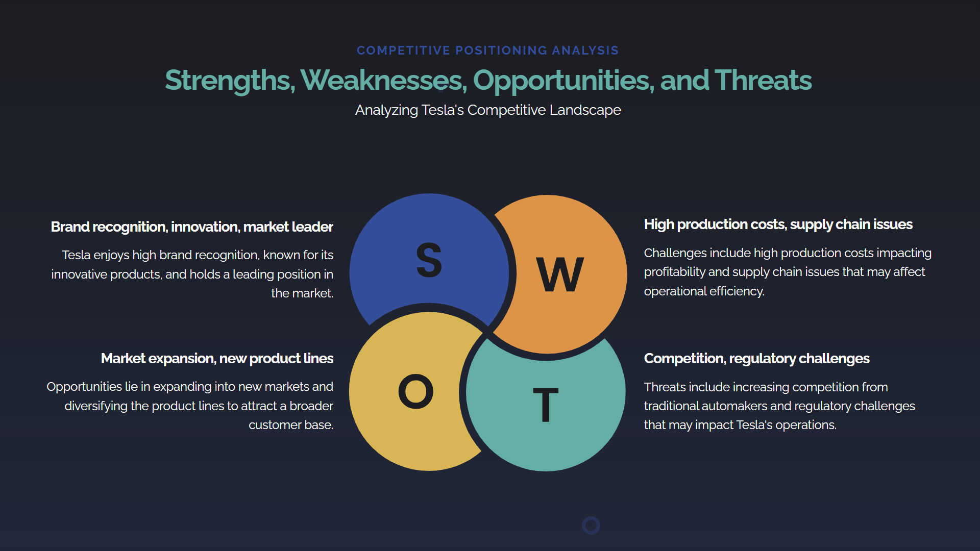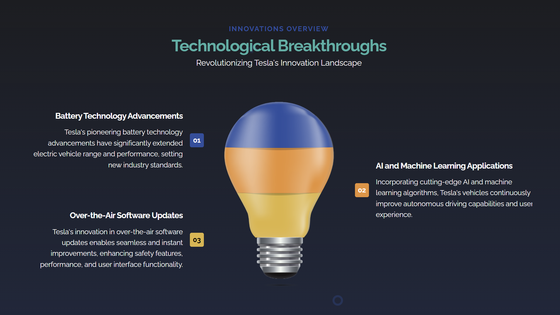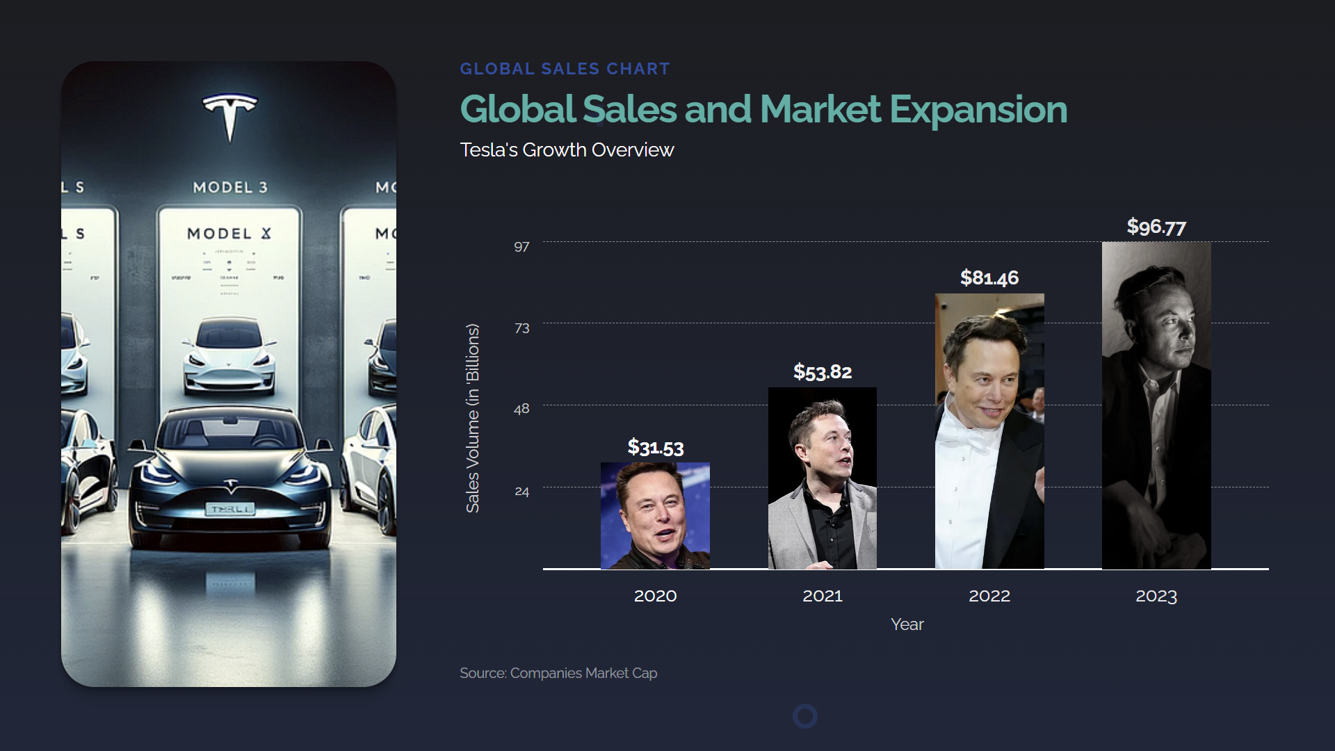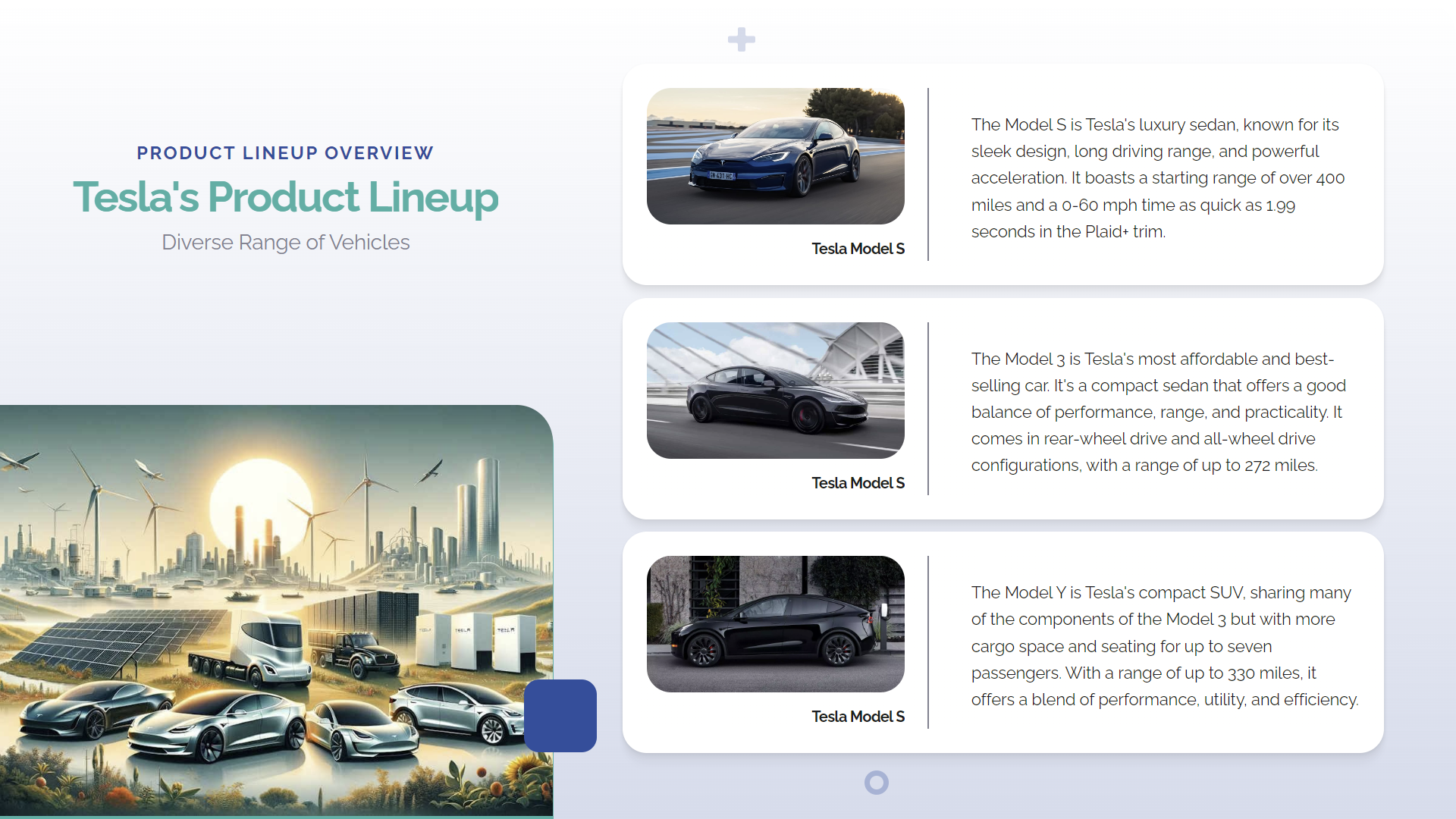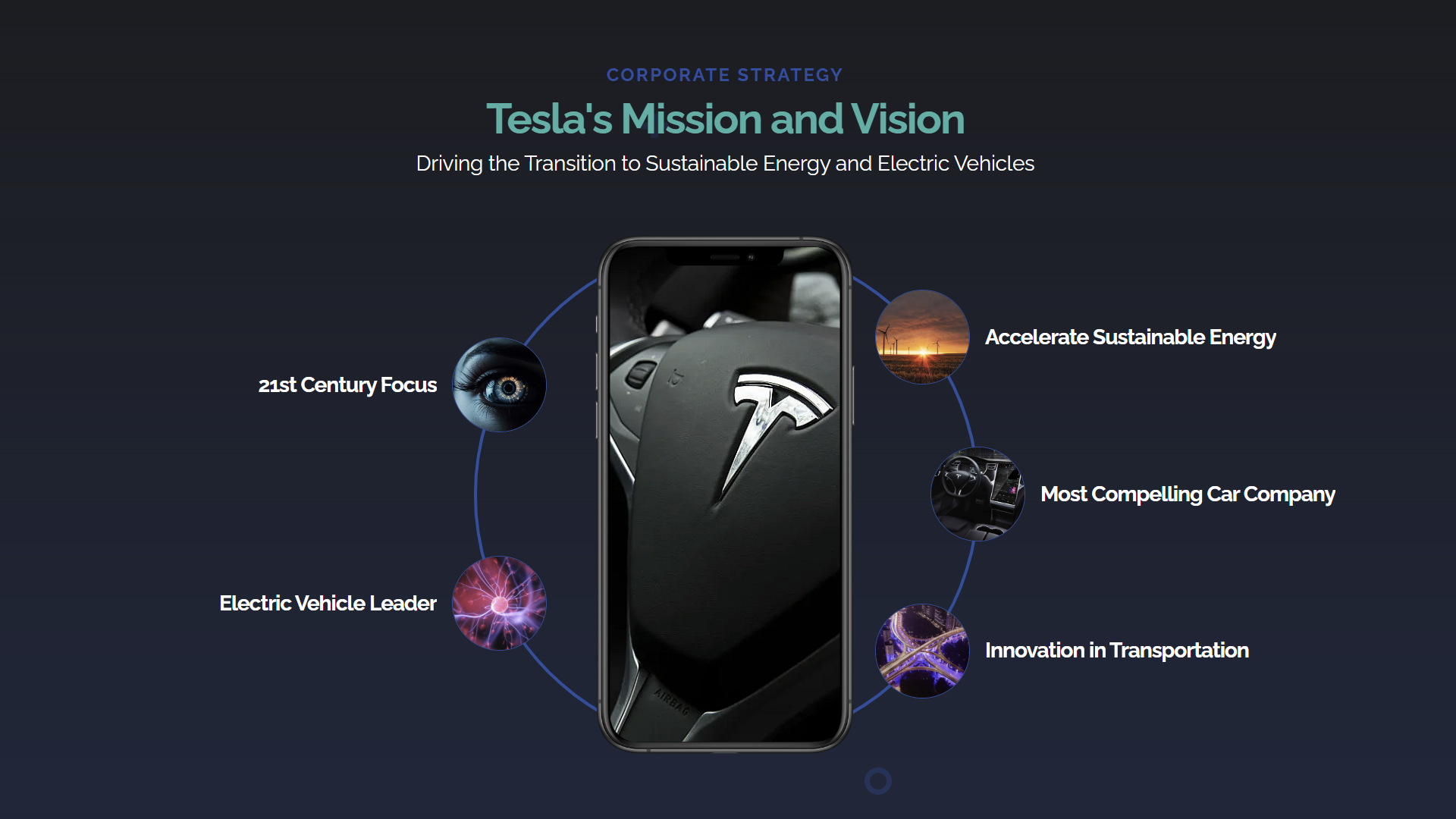 Tesla, Inc. is an American electric vehicle and clean energy company that was founded in 2003 by Elon Musk, JB Straubel, Martin Eberhard, and Marc Tarpenning. The company is headquartered in Palo Alto, California, and has become one of the leading players in the electric vehicle (EV) industry. Tesla's mission is to accelerate the world's transition to sustainable energy through the production of electric vehicles, solar power systems, and energy storage products. The company's product lineup includes the Model S, Model X, Model 3, Model Y, and the upcoming Cybertruck, among others.
